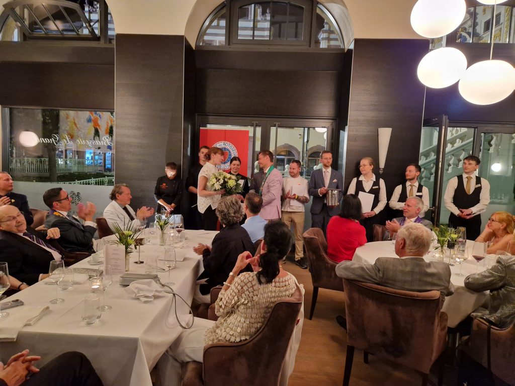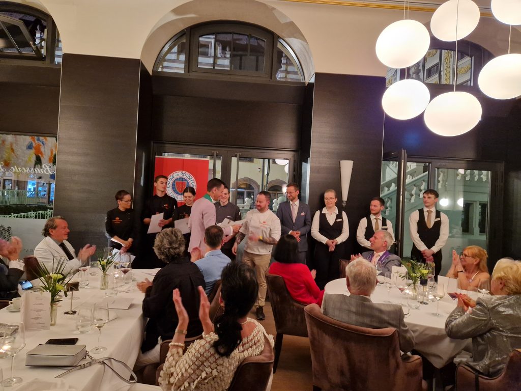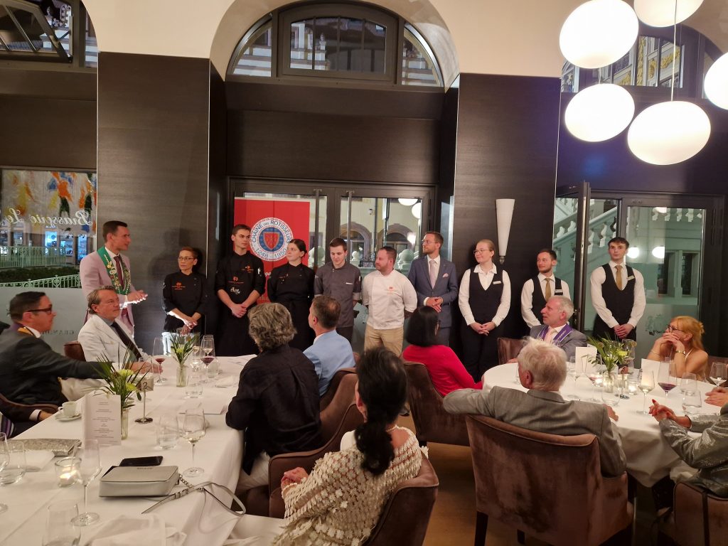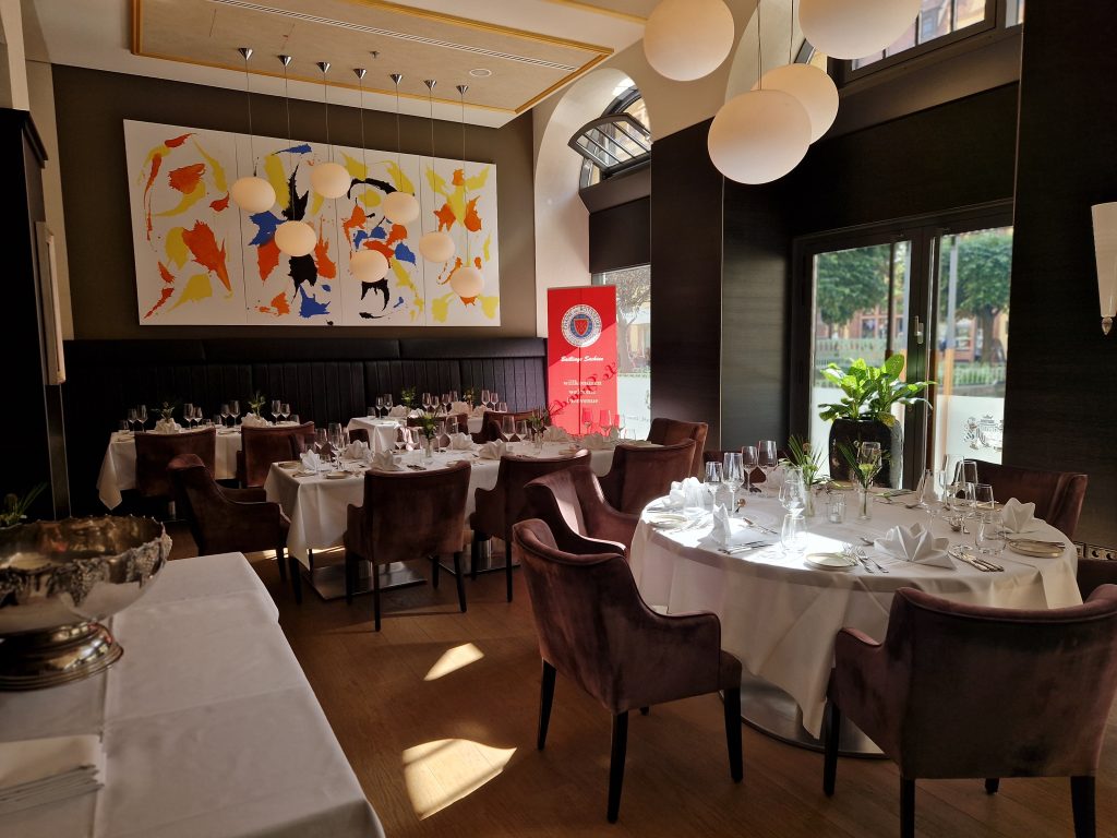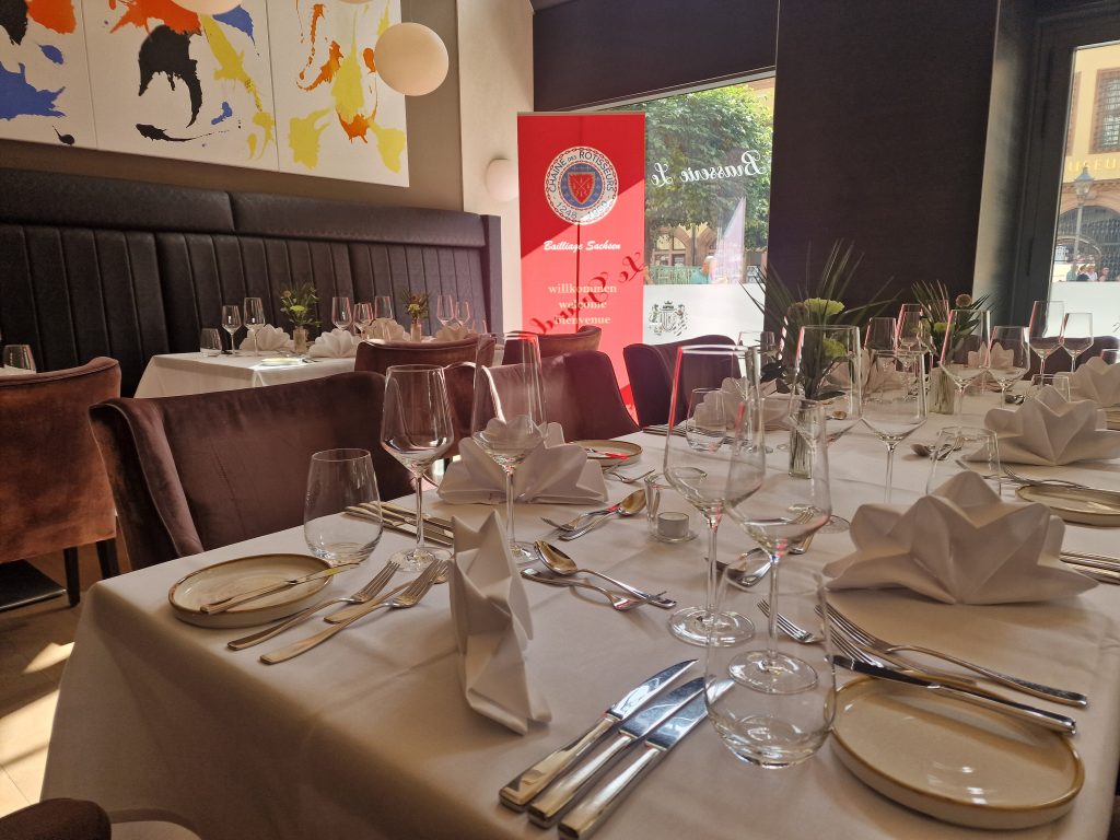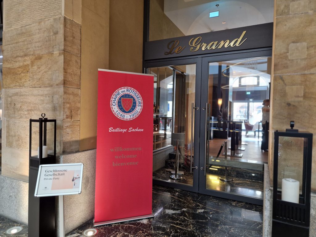 Aber was gab es denn Neues? Zum einen freuten wir uns darüber, dass Peter Peters, ein Leipziger Chaîne- Urgestein und langjähriger Bailli von Sachsen, nun neuer Bailli Délégué d‘Allemagne ist. Zum anderen konnten wir mit Maître Hôtelier Charlotte Holtmann ein neues Mitglied in unserer Bailliage begrüßen. Sie hat zum Jahreswechsel als General Manager die Führung des Grandhotels übernommen und sichert mit ihrer Mitgliedschaft den Bestand des Hotels als Chaîne-Haus. So war der Abend eine gute Gelegenheit zum gegenseitigen Kennenlernen. Für uns neu war auch das Restaurant. Erstmals trafen wir uns in der Brasserie Le Grand. Dem Namen machte das Küchenteam um Kai Becker mit einem französisch inspirierten 5-Gang-Menü alle Ehre. Überaus aufmerksam und freundlich umsorgte uns der Service unter Leitung von Markus Weller. Die Weinauswahl war harmonisch auf das Menü abgestimmt und selbst Sonderwünsche der Gäste wurden gern erfüllt